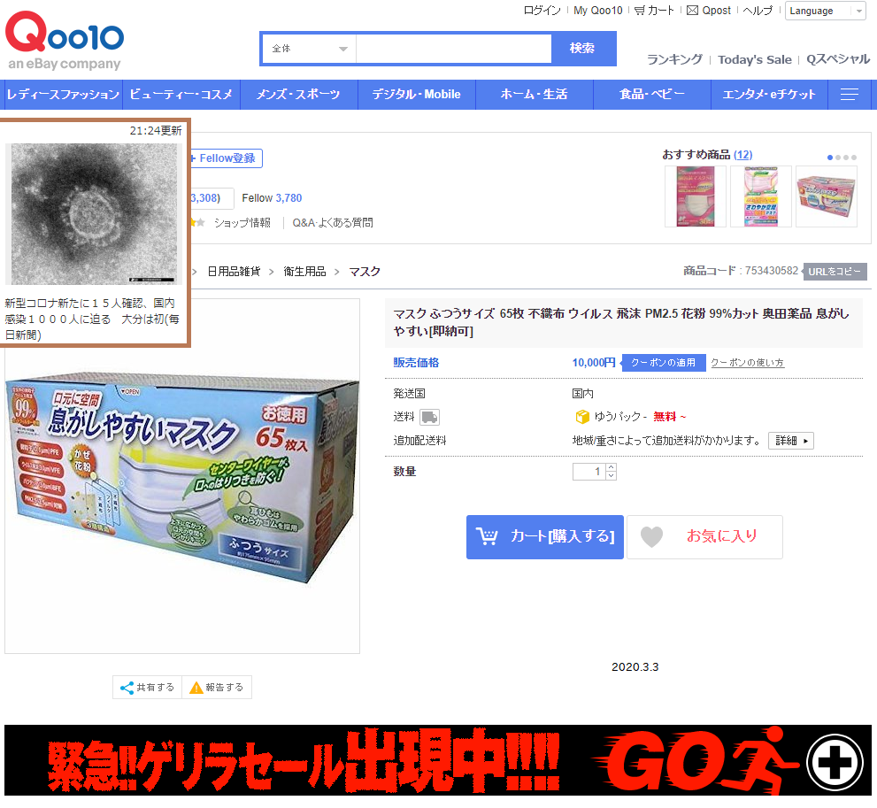 これは、休校措置が出た頃のマスク価格を表した例で、私はマスクはどうせ手に入らないことが分かりきっていたので、アクセスもしないでいたのだが、興味本位でスナップしたものである。一月前には1箱100万円超えの出品がAmazonに出ていたのを、これは社会への諷刺の新手法なのだろうかと思って眺めていた。さすがに少しは落ち着いた?のか、左は1箱が1万円、右は1箱が2万円超えで、同じ日に出ていたもの、どちらも昨年末まで近所のドラッグストアでよく見かけたり購入したりしていたものだ。その頃は左が1箱500円くらい、右が1箱1,000円くらいだった。なお付け加えると、3月16日の今日現在、マスクは依然として正規の卸売りルートに乗っている様子が見えない。変わったのは、昨日から転売に対する罰則規定が加わったことぐらいだ。今では品物自体が見えない。東日本大震災の頃の乾電池1本5,000円也と比べて、「転売ヤー」の数は最早数えることもできないほどだ。普通の会社人や主婦が、正規の価格に近い値で出している通販会社から、大量にポチって、少し置いて値動きを見、5倍10倍ないしそれ以上の価格でメルカリやオークション、Amazonのマーケットなどで出品するわけである。1日に100万円以上の売り上げを出す凄腕のセミプロから、退職後の年金の足し前にお小遣い貯金やへそくりを少しでも増やそうという、健気でさもしい小市民まで(ご同輩!)、千差万別だが、これはもはや社会現象となった。